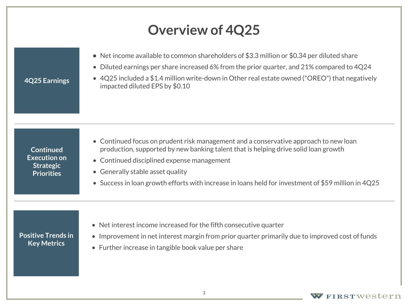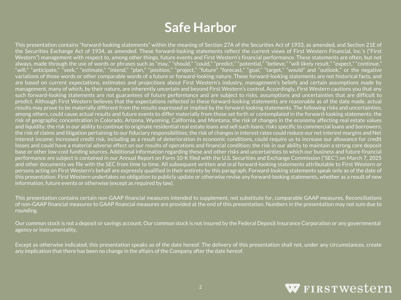 Safe Harbor 2 This presentation contains “forward-looking statements” within the meaning of Section 27A of the Securities Act of 1933, as amended, and Section 21E of the Securities Exchange Act of 1934, as amended. These forward-looking statements reflect the current views of First Western Financial, Inc.’s (“First Western”) management with respect to, among other things, future events and First Western’s financial performance. These statements are often, but not always, made through the use of words or phrases such as “may,” “should,” “could,” “predict,” “potential,” “believe,” “will likely result,” “expect,” “continue,” “will,” “anticipate,” “seek,” “estimate,” “intend,” “plan,” “position,” “project,” “future” “forecast,” “goal,” “target,” “would” and “outlook,” or the negative variations of those words or other comparable words of a future or forward-looking nature. These forward-looking statements are not historical facts, and are based on current expectations, estimates and projections about First Western’s industry, management’s beliefs and certain assumptions made by management, many of which, by their nature, are inherently uncertain and beyond First Western’s control. Accordingly, First Western cautions you that any such forward-looking statements are not guarantees of future performance and are subject to risks, assumptions and uncertainties that are difficult to predict. Although First Western believes that the expectations reflected in these forward-looking statements are reasonable as of the date made, actual results may prove to be materially different from the results expressed or implied by the forward-looking statements. The following risks and uncertainties, among others, could cause actual results and future events to differ materially from those set forth or contemplated in the forward-looking statements: the risk of geographic concentration in Colorado, Arizona, Wyoming, California, and Montana; the risk of changes in the economy affecting real estate values and liquidity; the risk in our ability to continue to originate residential real estate loans and sell such loans; risks specific to commercial loans and borrowers; the risk of claims and litigation pertaining to our fiduciary responsibilities; the risk of changes in interest rates could reduce our net interest margins and Net interest income; increased credit risk, including as a result of deterioration in economic conditions, could require us to increase our allowance for credit losses and could have a material adverse effect on our results of operations and financial condition; the risk in our ability to maintain a strong core deposit base or other low-cost funding sources. Additional information regarding these and other risks and uncertainties to which our business and future financial performance are subject is contained in our Annual Report on Form 10-K filed with the U.S. Securities and Exchange Commission (“SEC”) on March 7, 2025 and other documents we file with the SEC from time to time. All subsequent written and oral forward-looking statements attributable to First Western or persons acting on First Western’s behalf are expressly qualified in their entirety by this paragraph. Forward-looking statements speak only as of the date of this presentation. First Western undertakes no obligation to publicly update or otherwise revise any forward-looking statements, whether as a result of new information, future events or otherwise (except as required by law). This presentation contains certain non-GAAP financial measures intended to supplement, not substitute for, comparable GAAP measures. Reconciliations of non-GAAP financial measures to GAAP financial measures are provided at the end of this presentation. Numbers in the presentation may not sum due to rounding. Our common stock is not a deposit or savings account. Our common stock is not insured by the Federal Deposit Insurance Corporation or any governmental agency or instrumentality. Except as otherwise indicated, this presentation speaks as of the date hereof. The delivery of this presentation shall not, under any circumstances, create any implication that there has been no change in the affairs of the Company after the date hereof.