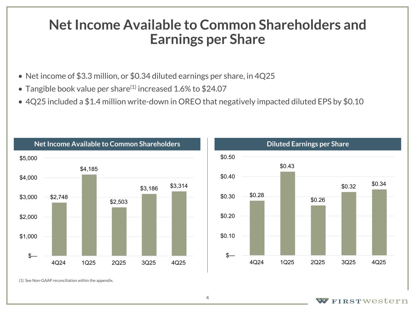 157 180 196 164 166 168 62 94 111 154 161 132 122 125 129 76 78 86 255 255 255 Chart color Table color Special Headlines Slide Headlines / Text on light background Primary Colors Secondary Colors Primary Background / Call Out Boxes / Text on dark background Chart color Table Color Tertiary Colors Chart color Table Color Chart Color Chart Color Approved Fonts AaBbCc 123 Lora (bold) Slide Headlines / Special Headlines AaBbCc 123 Lato(regular, bold, italics) Body Copy / Subheadings / Small Text Descriptions Overview of 4Q25 4Q25 Earnings • Net income available to common shareholders of $3.3 million or $0.34 per diluted share • Diluted earnings per share increased 6% from the prior quarter, and 21% compared to 4Q24 • 4Q25 included a $1.4 million write-down in Other real estate owned ("OREO") that negatively impacted diluted EPS by $0.10 Continued Execution on Strategic Priorities • Continued focus on prudent risk management and a conservative approach to new loan production, supported by new banking talent that is helping drive solid loan growth • Continued disciplined expense management • Generally stable asset quality • Success in loan growth efforts with increase in loans held for investment of $59 million in 4Q25 Positive Trends in Key Metrics • Net interest income increased for the fifth consecutive quarter • Improvement in net interest margin from prior quarter primarily due to improved cost of funds • Further increase in tangible book value per share 3