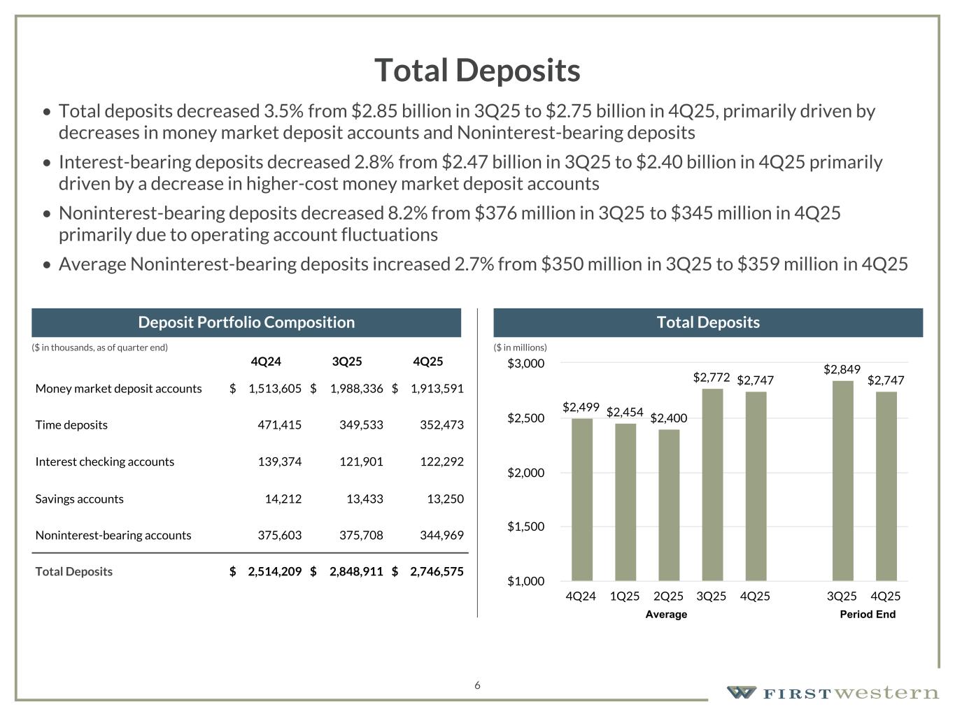 157 180 196 164 166 168 62 94 111 154 161 132 122 125 129 76 78 86 255 255 255 Chart color Table color Special Headlines Slide Headlines / Text on light background Primary Colors Secondary Colors Primary Background / Call Out Boxes / Text on dark background Chart color Table Color Tertiary Colors Chart color Table Color Chart Color Chart Color Approved Fonts AaBbCc 123 Lora (bold) Slide Headlines / Special Headlines AaBbCc 123 Lato (regular, bold, italics) Body Copy / Subheadings / Small Text Descriptions 5 Loan Portfolio • Total loans held for investment increased $59.4 million from prior quarter due to strong loan production • New loan production diversified across markets and loan types • New loan production in 4Q25 of $146.2 million with a focus on relationship-based lending • Average rate on new loan production was 6.36% in 4Q25, consistent with 6.38% in 3Q25 4Q24 3Q25 4Q25 Cash, securities and other $ 120,005 $ 159,204 $ 164,787 Consumer and other 17,333 12,254 19,504 Construction and development 315,686 230,600 189,790 1-4 family residential 960,354 1,041,075 1,030,211 Non-owner occupied CRE 614,384 728,039 813,408 Owner occupied CRE 173,223 191,239 205,063 Commercial and industrial 220,501 225,919 226,107 Total $ 2,421,486 $ 2,588,330 $ 2,648,870 Loans accounted for at fair value(2) 7,508 4,319 3,216 Total Loans HFI $ 2,428,994 $ 2,592,649 $ 2,652,086 Mortgage loans held for sale 25,455 21,806 40,176 Loans held for sale 251 — — Total Loans $ 2,454,700 $ 2,614,455 $ 2,692,262 (1) Represents unpaid principal balance. Excludes deferred fees, unamortized premiums, basis adjustments, net. (2) Excludes fair value adjustments on loans accounted for under the fair value option. ($ in thousands, as of quarter end) Loan Portfolio Composition(1) Loan Portfolio Details Loan Production & Loan Payoffs Total Loans(1) $2,421 $2,428 $2,468 $2,594 $2,676 $2,614 $2,692 4Q24 1Q25 2Q25 3Q25 4Q25 3Q25 4Q25 $1,000 $1,500 $2,000 $2,500 $3,000 Average Period End $93.5 $70.8 $166.9 $145.7 $146.2 $97.1 $71.6 $122.6 $110.1 $131.3 Production Loan Payoffs 4Q24 1Q25 2Q25 3Q25 4Q25 $0 $50 $100 $150 $200 ($ in millions) ($ in millions)