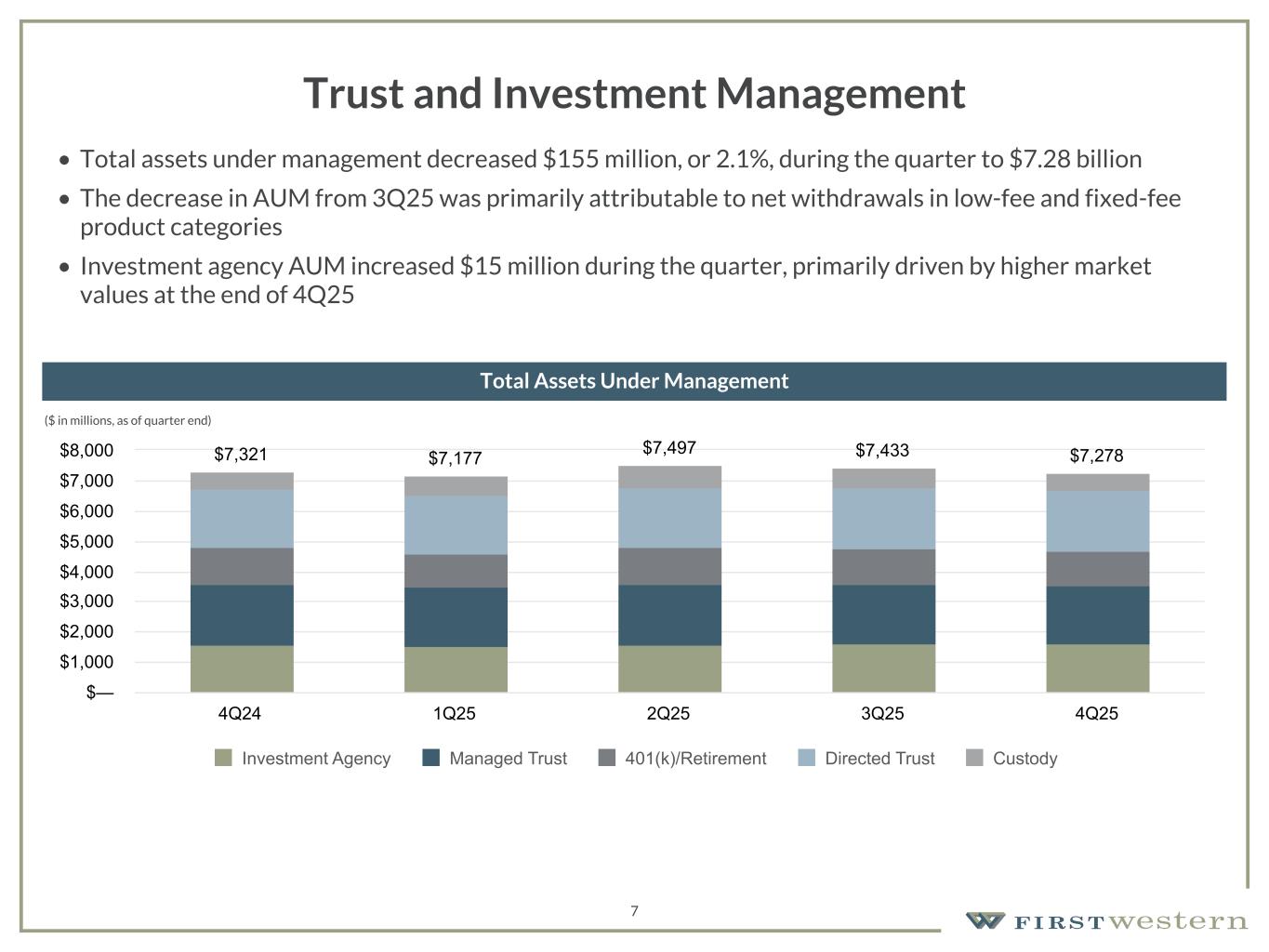 157 180 196 164 166 168 62 94 111 154 161 132 122 125 129 76 78 86 255 255 255 Chart color Table color Special Headlines Slide Headlines / Text on light background Primary Colors Secondary Colors Primary Background / Call Out Boxes / Text on dark background Chart color Table Color Tertiary Colors Chart color Table Color Chart Color Chart Color Approved Fonts AaBbCc 123 Lora (bold) Slide Headlines / Special Headlines AaBbCc 123 Lato (regular, bold, italics) Body Copy / Subheadings / Small Text Descriptions 6 Total Deposits • Total deposits decreased 3.5% from $2.85 billion in 3Q25 to $2.75 billion in 4Q25, primarily driven by decreases in money market deposit accounts and Noninterest-bearing deposits • Interest-bearing deposits decreased 2.8% from $2.47 billion in 3Q25 to $2.40 billion in 4Q25 primarily driven by a decrease in higher-cost money market deposit accounts • Noninterest-bearing deposits decreased 8.2% from $376 million in 3Q25 to $345 million in 4Q25 primarily due to operating account fluctuations • Average Noninterest-bearing deposits increased 2.7% from $350 million in 3Q25 to $359 million in 4Q25 4Q24 3Q25 4Q25 Money market deposit accounts $ 1,513,605 $ 1,988,336 $ 1,913,591 Time deposits 471,415 349,533 352,473 Interest checking accounts 139,374 121,901 122,292 Savings accounts 14,212 13,433 13,250 Noninterest-bearing accounts 375,603 375,708 344,969 Total Deposits $ 2,514,209 $ 2,848,911 $ 2,746,575 Deposit Portfolio Composition Total Deposits $2,499 $2,454 $2,400 $2,772 $2,747 $2,849 $2,747 4Q24 1Q25 2Q25 3Q25 4Q25 3Q25 4Q25 $1,000 $1,500 $2,000 $2,500 $3,000 Average Period End ($ in millions)($ in thousands, as of quarter end)