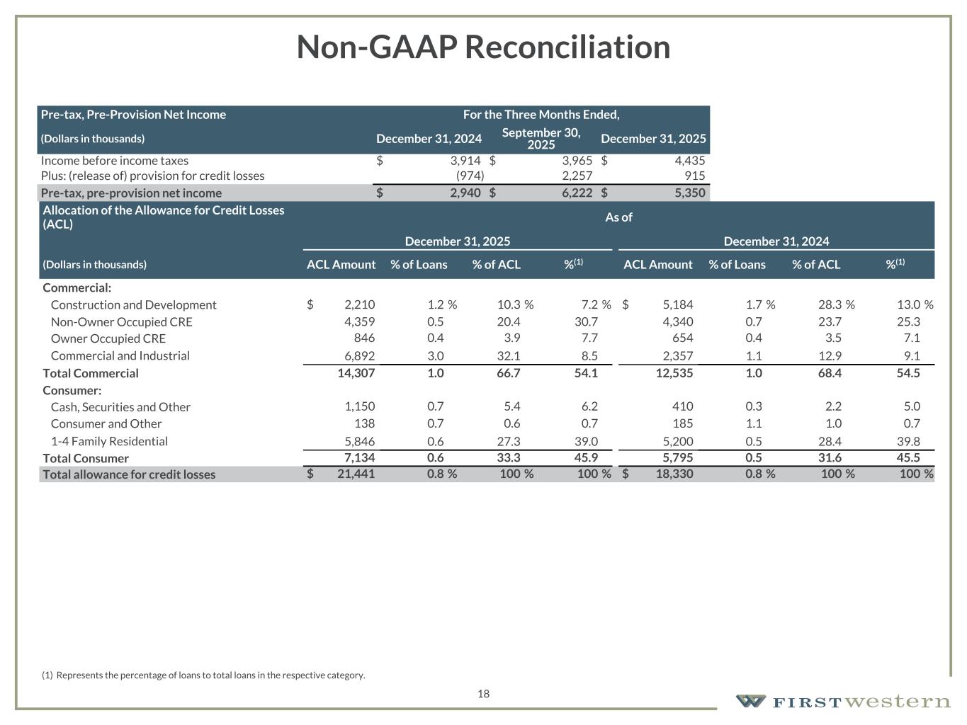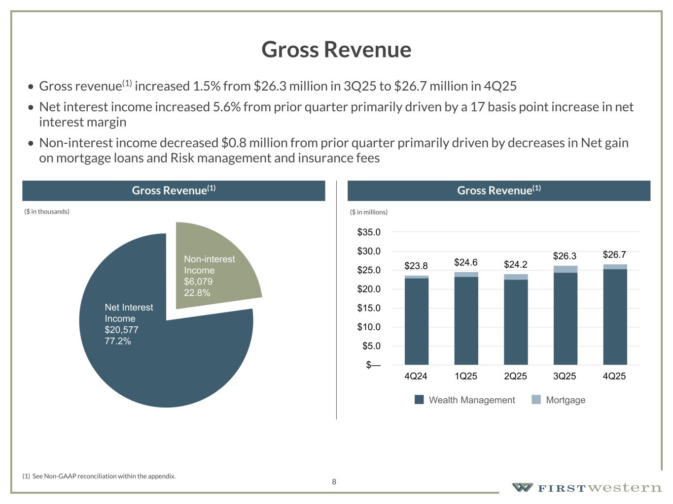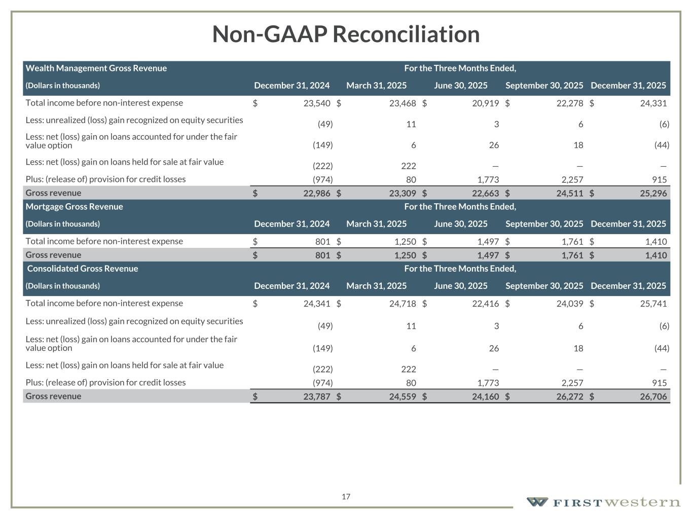157 180 196 164 166 168 62 94 111 154 161 132 122 125 129 76 78 86 255 255 255 Chart color Table color Special Headlines Slide Headlines / Text on light background Primary Colors Secondary Colors Primary Background / Call Out Boxes / Text on dark background Chart color Table Color Tertiary Colors Chart color Table Color Chart Color Chart Color Approved Fonts AaBbCc 123 Lora (bold) Slide Headlines / Special Headlines AaBbCc 123 Lato (regular, bold, italics) Body Copy / Subheadings / Small Text Descriptions 17 Non-GAAP Reconciliation Wealth Management Gross Revenue For the Three Months Ended, (Dollars in thousands) December 31, 2024 March 31, 2025 June 30, 2025 September 30, 2025 December 31, 2025 Total income before non-interest expense $ 23,540 $ 23,468 $ 20,919 $ 22,278 $ 24,331 Less: unrealized (loss) gain recognized on equity securities (49) 11 3 6 (6) Less: net (loss) gain on loans accounted for under the fair value option (149) 6 26 18 (44) Less: net (loss) gain on loans held for sale at fair value (222) 222 — — — Plus: (release of) provision for credit losses (974) 80 1,773 2,257 915 Gross revenue $ 22,986 $ 23,309 $ 22,663 $ 24,511 $ 25,296 Mortgage Gross Revenue For the Three Months Ended, (Dollars in thousands) December 31, 2024 March 31, 2025 June 30, 2025 September 30, 2025 December 31, 2025 Total income before non-interest expense $ 801 $ 1,250 $ 1,497 $ 1,761 $ 1,410 Gross revenue $ 801 $ 1,250 $ 1,497 $ 1,761 $ 1,410 Consolidated Gross Revenue For the Three Months Ended, (Dollars in thousands) December 31, 2024 March 31, 2025 June 30, 2025 September 30, 2025 December 31, 2025 Total income before non-interest expense $ 24,341 $ 24,718 $ 22,416 $ 24,039 $ 25,741 Less: unrealized (loss) gain recognized on equity securities (49) 11 3 6 (6) Less: net (loss) gain on loans accounted for under the fair value option (149) 6 26 18 (44) Less: net (loss) gain on loans held for sale at fair value (222) 222 — — — Plus: (release of) provision for credit losses (974) 80 1,773 2,257 915 Gross revenue $ 23,787 $ 24,559 $ 24,160 $ 26,272 $ 26,706