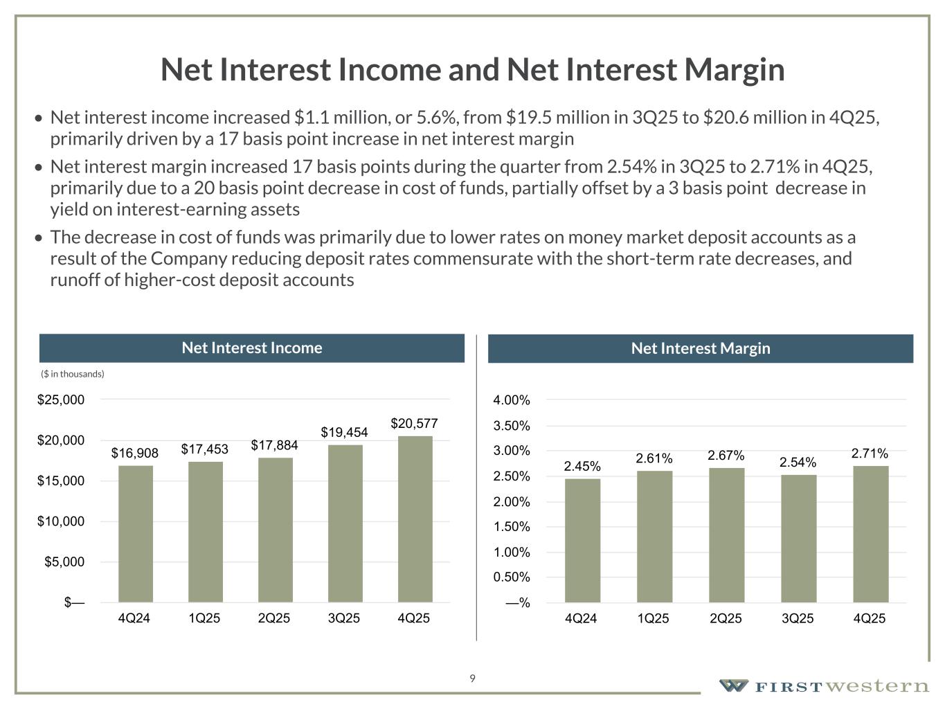 157 180 196 164 166 168 62 94 111 154 161 132 122 125 129 76 78 86 255 255 255 Chart color Table color Special Headlines Slide Headlines / Text on light background Primary Colors Secondary Colors Primary Background / Call Out Boxes / Text on dark background Chart color Table Color Tertiary Colors Chart color Table Color Chart Color Chart Color Approved Fonts AaBbCc 123 Lora (bold) Slide Headlines / Special Headlines AaBbCc 123 Lato (regular, bold, italics) Body Copy / Subheadings / Small Text Descriptions (1) See Non-GAAP reconciliation within the appendix. Gross Revenue Gross Revenue(1) Gross Revenue(1) 8 $23.8 $24.6 $24.2 $26.3 $26.7 Wealth Management Mortgage 4Q24 1Q25 2Q25 3Q25 4Q25 $— $5.0 $10.0 $15.0 $20.0 $25.0 $30.0 $35.0 • Gross revenue(1) increased 1.5% from $26.3 million in 3Q25 to $26.7 million in 4Q25 • Net interest income increased 5.6% from prior quarter primarily driven by a 17 basis point increase in net interest margin • Non-interest income decreased $0.8 million from prior quarter primarily driven by decreases in Net gain on mortgage loans and Risk management and insurance fees Non-interest Income $6,079 22.8% Net Interest Income $20,577 77.2% ($ in thousands) ($ in millions)
