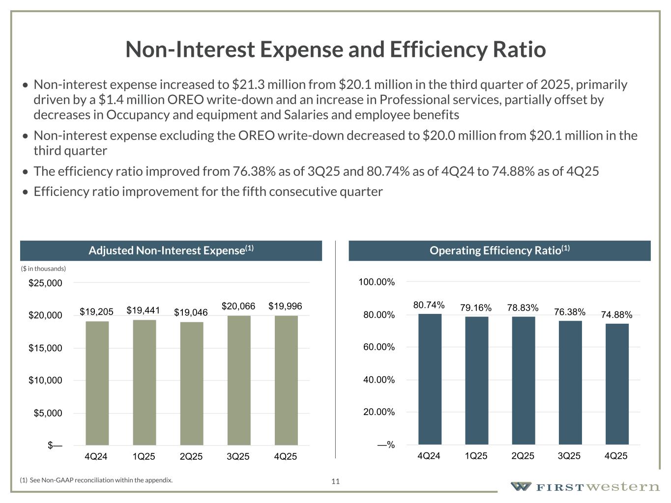 157 180 196 164 166 168 62 94 111 154 161 132 122 125 129 76 78 86 255 255 255 Chart color Table color Special Headlines Slide Headlines / Text on light background Primary Colors Secondary Colors Primary Background / Call Out Boxes / Text on dark background Chart color Table Color Tertiary Colors Chart color Table Color Chart Color Chart Color Approved Fonts AaBbCc 123 Lora (bold) Slide Headlines / Special Headlines AaBbCc 123 Lato (regular, bold, italics) Body Copy / Subheadings / Small Text Descriptions 10 Non-Interest Income • Non-interest income decreased $0.8 million to $6.1 million from prior quarter primarily driven by decreases in Net gain on mortgage loans and Risk management and insurance fees • The decrease in Net gain on mortgage loans was driven by an increase in commissions due to higher funded volume and slightly lower margins due to a highly competitive mortgage market • The decrease in Risk management and insurance fees was driven by lower new case activity Total Non-Interest Income Trust and Investment Management Fees $6,459 $7,345 $6,305 $6,842 $6,079 Trust and Investment Management Fees Bank Fees Net Gain on Mortgage Loans Net gain on OREO Risk Management and Insurance Fees Other 4Q24 1Q25 2Q25 3Q25 4Q25 $(2,000) $— $2,000 $4,000 $6,000 $8,000 $10,000 $4,660 $4,677 $4,512 $4,629 $4,634 4Q24 1Q25 2Q25 3Q25 4Q25 $— $2,000 $4,000 $6,000 ($ in thousands) ($ in thousands)