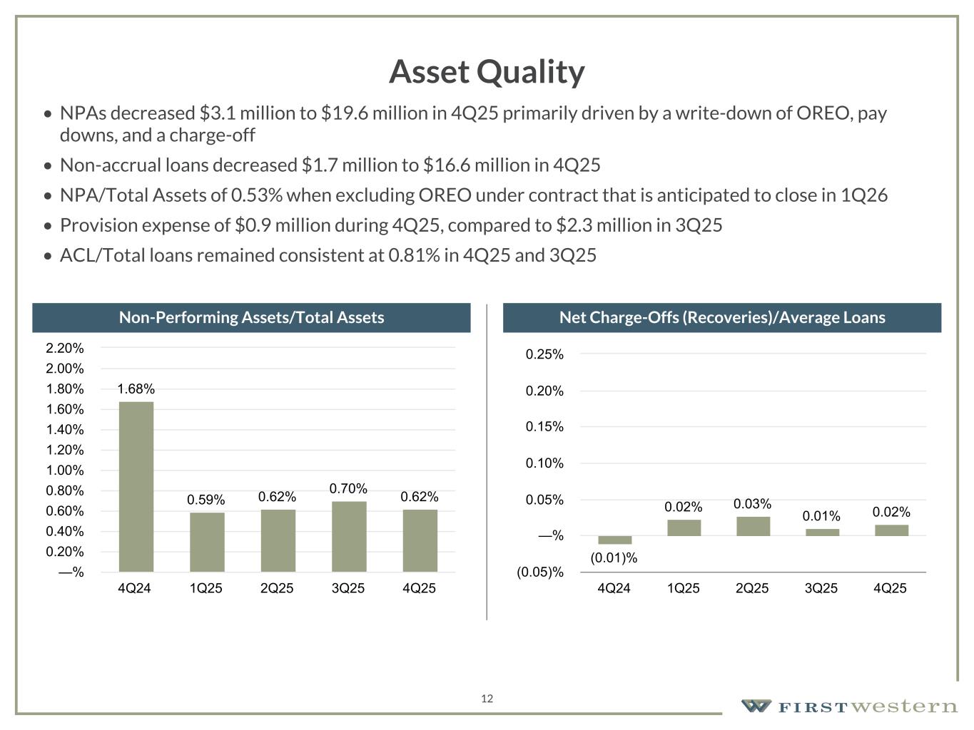 157 180 196 164 166 168 62 94 111 154 161 132 122 125 129 76 78 86 255 255 255 Chart color Table color Special Headlines Slide Headlines / Text on light background Primary Colors Secondary Colors Primary Background / Call Out Boxes / Text on dark background Chart color Table Color Tertiary Colors Chart color Table Color Chart Color Chart Color Approved Fonts AaBbCc 123 Lora (bold) Slide Headlines / Special Headlines AaBbCc 123 Lato (regular, bold, italics) Body Copy / Subheadings / Small Text Descriptions 11 Non-Interest Expense and Efficiency Ratio • Non-interest expense increased to $21.3 million from $20.1 million in the third quarter of 2025, primarily driven by a $1.4 million OREO write-down and an increase in Professional services, partially offset by decreases in Occupancy and equipment and Salaries and employee benefits • Non-interest expense excluding the OREO write-down decreased to $20.0 million from $20.1 million in the third quarter • The efficiency ratio improved from 76.38% as of 3Q25 and 80.74% as of 4Q24 to 74.88% as of 4Q25 • Efficiency ratio improvement for the fifth consecutive quarter (1) See Non-GAAP reconciliation within the appendix. Adjusted Non-Interest Expense(1) Operating Efficiency Ratio(1) (1) (1) (1) $19,205 $19,441 $19,046 $20,066 $19,996 4Q24 1Q25 2Q25 3Q25 4Q25 $— $5,000 $10,000 $15,000 $20,000 $25,000 80.74% 79.16% 78.83% 76.38% 74.88% 4Q24 1Q25 2Q25 3Q25 4Q25 —% 20.00% 40.00% 60.00% 80.00% 100.00% ($ in thousands)
