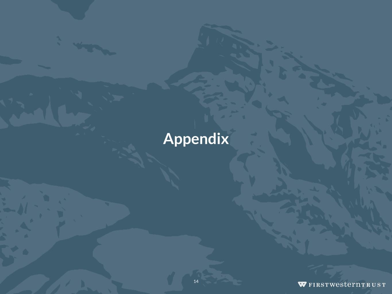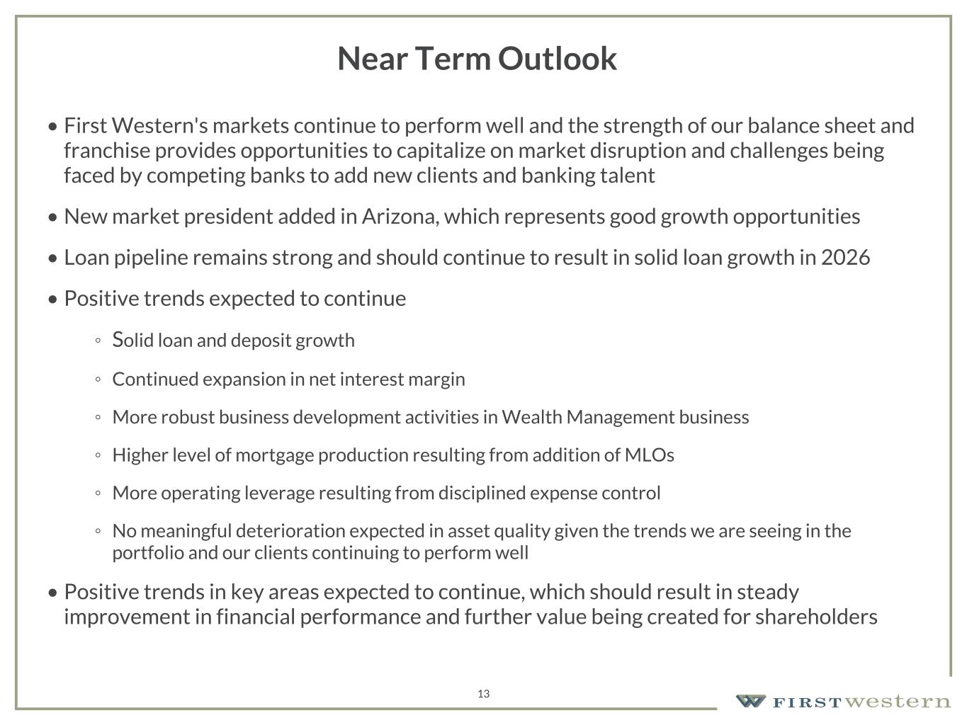 157 180 196 164 166 168 62 94 111 154 161 132 122 125 129 76 78 86 255 255 255 Chart color Table color Special Headlines Slide Headlines / Text on light background Primary Colors Secondary Colors Primary Background / Call Out Boxes / Text on dark background Chart color Table Color Tertiary Colors Chart color Table Color Chart Color Chart Color Approved Fonts AaBbCc 123 Lora (bold) Slide Headlines / Special Headlines AaBbCc 123 Lato (regular, bold, italics) Body Copy / Subheadings / Small Text Descriptions 13 Near Term Outlook • First Western's markets continue to perform well and the strength of our balance sheet and franchise provides opportunities to capitalize on market disruption and challenges being faced by competing banks to add new clients and banking talent • New market president added in Arizona, which represents good growth opportunities • Loan pipeline remains strong and should continue to result in solid loan growth in 2026 • Positive trends expected to continue ◦ Solid loan and deposit growth ◦ Continued expansion in net interest margin ◦ More robust business development activities in Wealth Management business ◦ Higher level of mortgage production resulting from addition of MLOs ◦ More operating leverage resulting from disciplined expense control ◦ No meaningful deterioration expected in asset quality given the trends we are seeing in the portfolio and our clients continuing to perform well • Positive trends in key areas expected to continue, which should result in steady improvement in financial performance and further value being created for shareholders